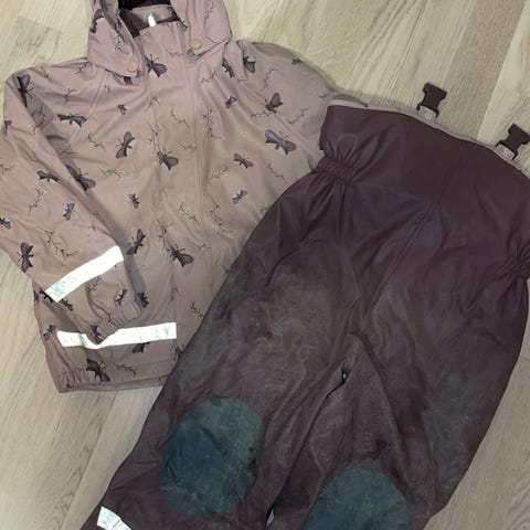 Foret regnsett fra Stormberg selges. Stor i størrelsen. Mangler ett strikk (dressen er såpass stram i beina at strikk ikke har vært noe savn for barnet her, holder seg godt rundt støvel).