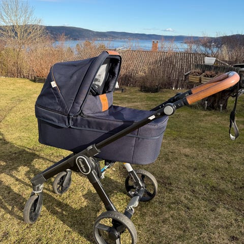 Emmaljunga NXT90 bagdel til barnevogn i mørk blå tekstil. Bagdelen har kalesje med lufting, avtagbart trekk og polstret innermadrass i lys tekstil. Medfølgende stelleveske i matchende mørk blå farge med flere lommer, håndtak og avtagbar skulderreim. Pent brukt til et barn.