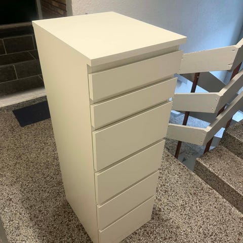 Selger også en kommode til, helt lik, men der mangler en planke i midten så pris på den 700,-