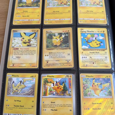 Pokemon samlekort med ulike Pikachu- og Pichu-motiv i samleperm. Kortene er plassert i plastlommer i perm for oppbevaring. Flere forskjellige utgaver og illustrasjoner av Pikachu er synlige, inkludert både standard- og holografiske kort. Passer for samlere av Pokemon-kort som ønsker flere varianter av Pikachu-relaterte kort til samlingen sin.