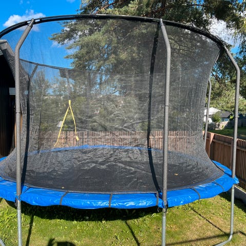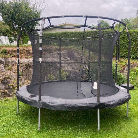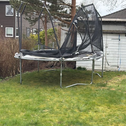 Nett og polstring fikk hard medfart i en storm, og må byttes ut eller brukes uten. Selve trampolinen og fjærene fungere som de skal. Gis bort. Må hentes.