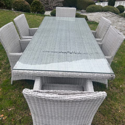 Ukjent merke hagebord med glassplate og 6 stoler grå rotting