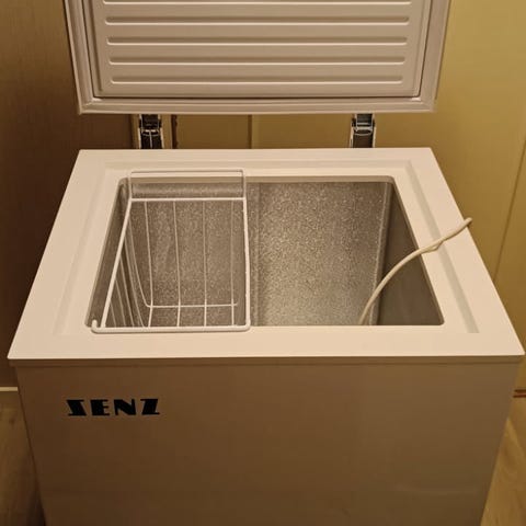 Fryseboksen har justerbar termostat på fronten med indikatorlamper for strøm og hurtigfrysing. Modellen er merket med «Winter Security» og kan brukes ved omgivelsestemperaturer ned til -15 °C, noe som gjør den egnet for plassering i for eksempel garasje eller bod innenfor angitte temperaturgrenser.