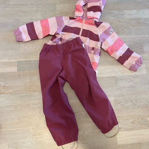 Regnsett har foret bukse. Størrelse 104. Pent brukt av et barn. Masse bruk igjen.