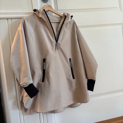 Regnponcho med ermer i mjuk PU knit som gir fint fall. Passformen er laus og størrelsane gode. Dette gjev moglegheit til betre bevegelse i leik.