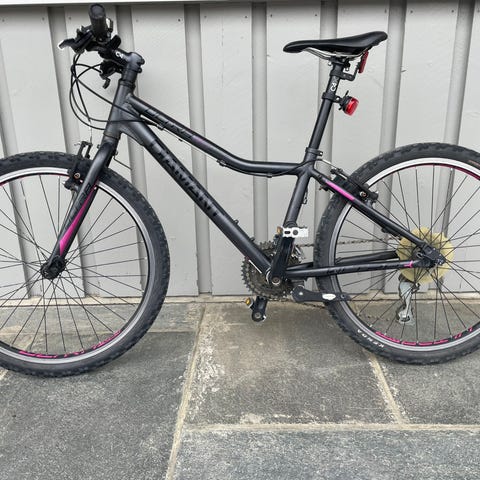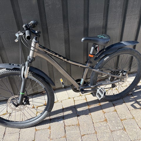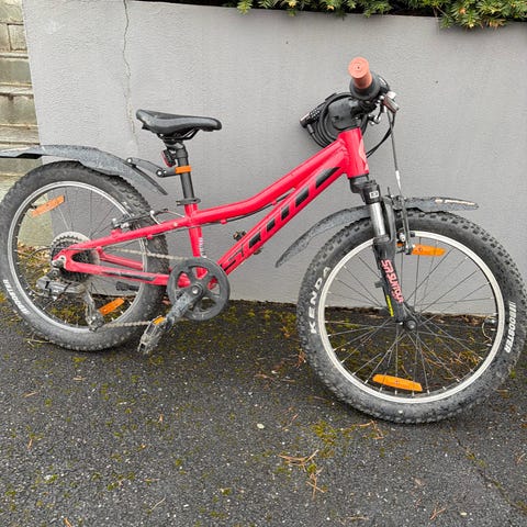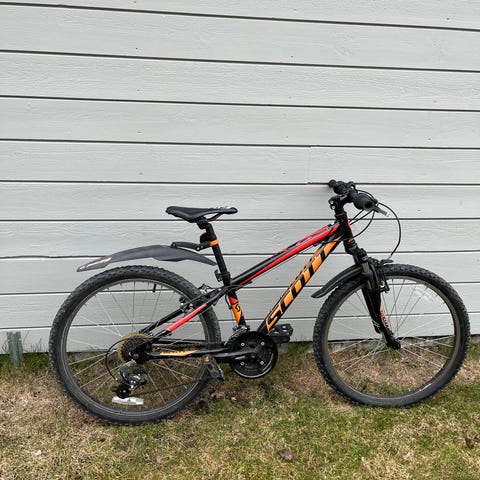 Scott barnesykkel med 24" hjul. Sykkelen har aluminiumsramme i hvitt med røde detaljer og rette styre. Utstyrt med Shimano girsystem med vriskifter på styret og felgbremser foran og bak. Sykkelen har skjermer bak, støtte og refleks på hjulene. Egnet som barnesykkel for bruk på vei og lett grusunderlag.