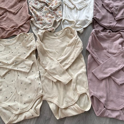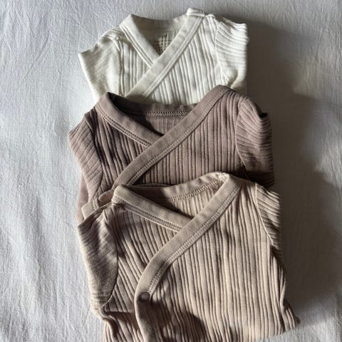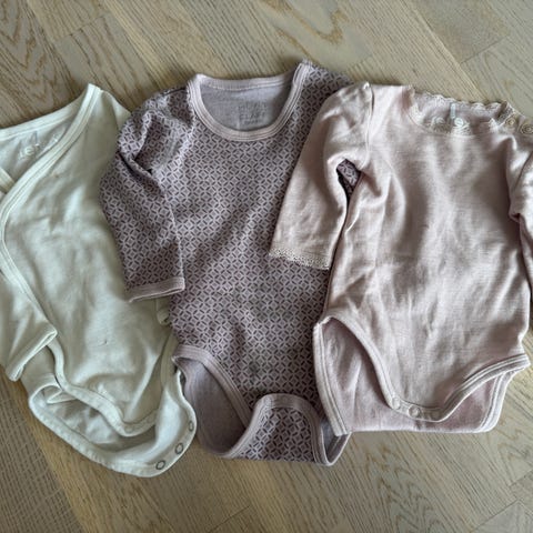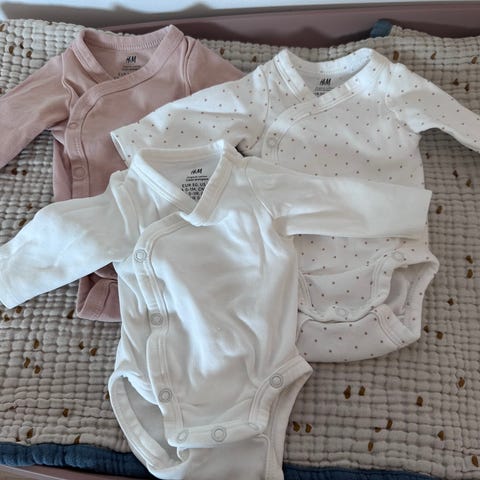 Tre omslagsbody fra H&M, en hvit, en rosa, en hvit med prikker.