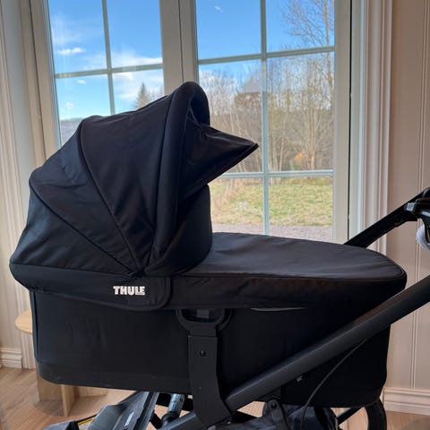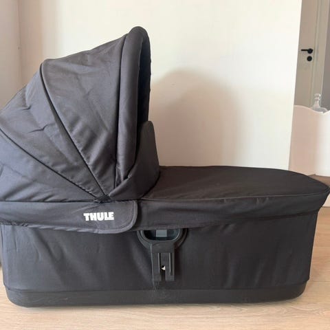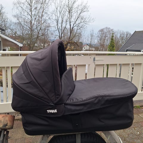 Bassinet/bagdel/liggedel/babybag til vognen Thule Urban Glide 2. Alltid lagret innendørs, ble kjøpt ny i 2023. Brukt av 2 babyer. Vi kjøpte den lite brukt for 7 mnd siden, men vi har brukt den noe mer. Litt småmerker under fra lasting inn og ut av bil og ved festing på vognen. Har alltid brukt skinn i bunnen. Myggnett, regntrekk og adaptere følger med.