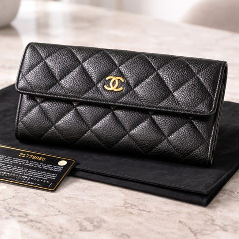 Selger en klassisk og tidløs Chanel kortholder i Classic flap i sort caviar-skinn med gullfarget CC-logo. Elegant og praktisk modell som rommer kort og små nødvendigheter – perfekt til både hverdag og fest.