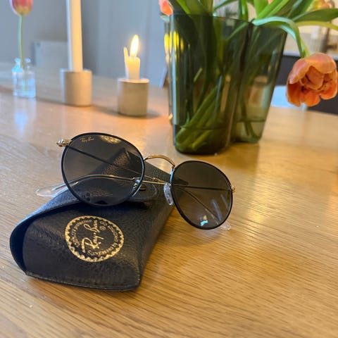 Ray-Ban solbriller for unisex med rund metallinnfatning og mørke grønne glass. Brillene har tynn, gullfarget ramme og nesebro i metall. Leveres med Ray-Ban etui og pusseklut, som vist på bildet. Egner seg som solbriller til daglig bruk.