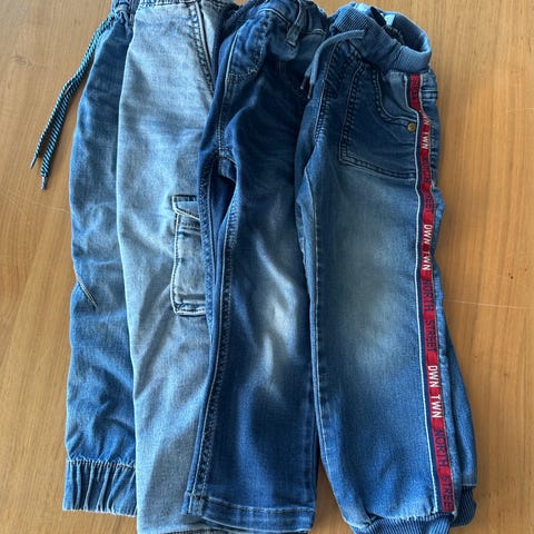 Selger buksepakke- 3 stk. jeans og 1 joggedress. De er brukt men mye bruk igjen. Passer perfekt til hverdagsbruk eller barnehagebruk. 2 stk. har små flekker på buksebena. Flekkene er ikke veldig synlige men på grunn av det selger jeg de billig. (se 2 siste bilder). Se gjerne mine andre anonnser😊 Lager gjerne pakkepris ved kjøp av 3+ annonser😄 Hvis du er interessert i flere annonser, kan prisen diskuteres😉