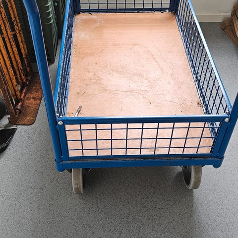 AJ Produkter tralle med plan lasteflate og hjul. Trallen har solid ramme i metall og en flat plattform som egner seg til transport av kasser, esker og annet gods. Utstyrt med fire hjul for enkel manøvrering og et håndtak i enden for skyving eller trekking. Passer til bruk på lager, verksted eller andre steder der det er behov for intern transport av varer.