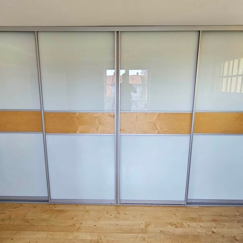 Skyvedørsgarderobe lys treimitasjon med innredning