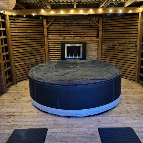 Flere steder på lokket har synlige sprekker og slitasje i overflaten, spesielt langs kantene og ved festene. Egnet som beskyttelseslokk til rundt boblebad/spabad/badestamp der målene passer. Kan bidra til å holde smuss ute og redusere varmetap når badet ikke er i bruk.
