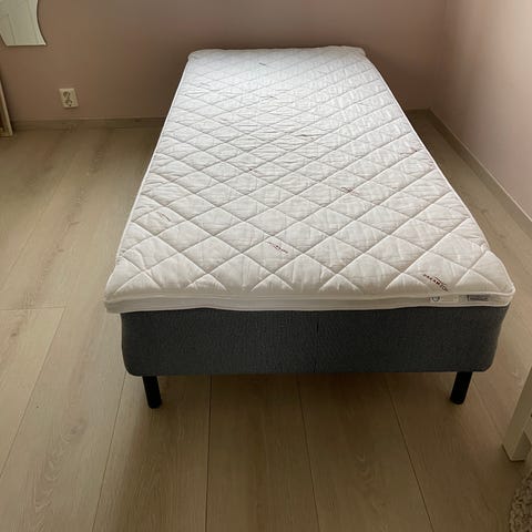 2 rammemadrasser som hver er 75 x 200 fra Jysk. I grå tekstil. Holdes sammen av klips til en dobbeltseng på 150 x 200. Følger med Jysk Dreamsone overmadrass på 150 cm. Pent brukt, men noe bruksmerker på ene hjørnet. Sorte ben. Høyde 37 cm uten overmadrass og ca 42 med overmadrass.