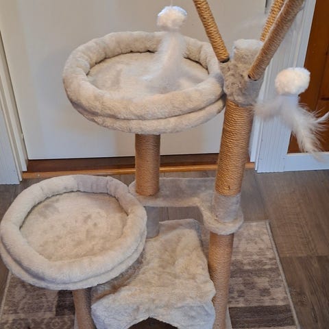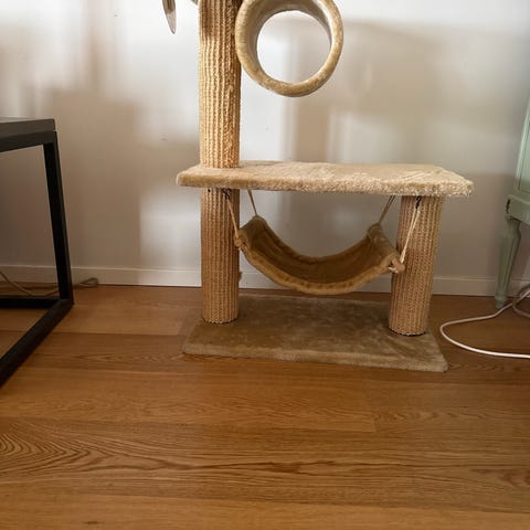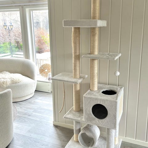 Klatrestativ til katt i lys beige farge. Stativet har en bunnplate, en lukket hule nederst med myk polstring, samt to høyere platåer. Øverste platå har en avtagbar, polstret liggekant og en overflate i sisal eller lignende materiale til kloring. Det følger med en leke med myk ball og flettet bånd som kan festes på stativet. Egnet som hvile- og lekeplass for katt innendørs.