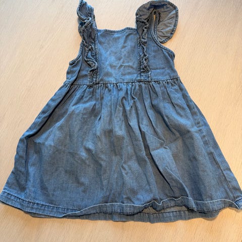 GAP kjole for jente i størrelse 6-12 mnd / ca 68-74. Kjolen er blå og laget av bomull. Den har korte ermer med rysjer, krage og knappelukking foran. Passer til hverdagsbruk eller enklere penbruk for baby/jente i tilsvarende størrelse.