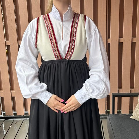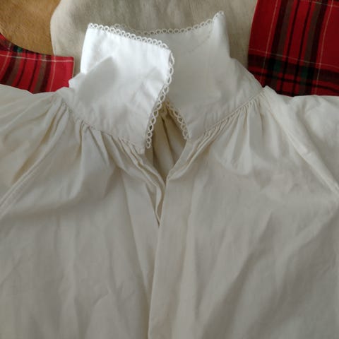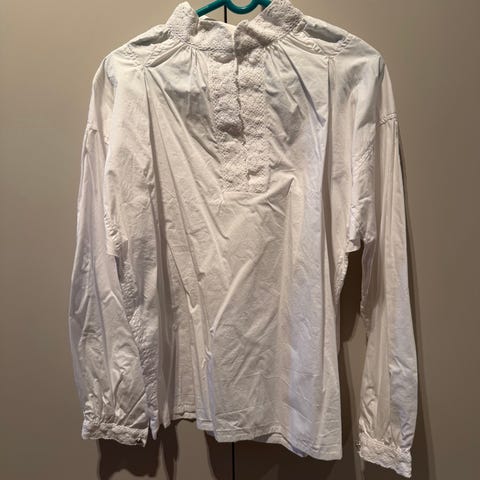 Flott, anvendelig hvit skjorte til alle bunader og festdrakter. Skjorten har dekorativ blonde-/nuperellekant på mansjetter og krage. Rynkesøm ved mansjettene og i halsen / skuldre. Droppede ermer med legg. Fin frontlukking og lett å ta av og på, over hodet. Kun brukt en gang.