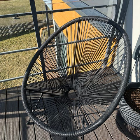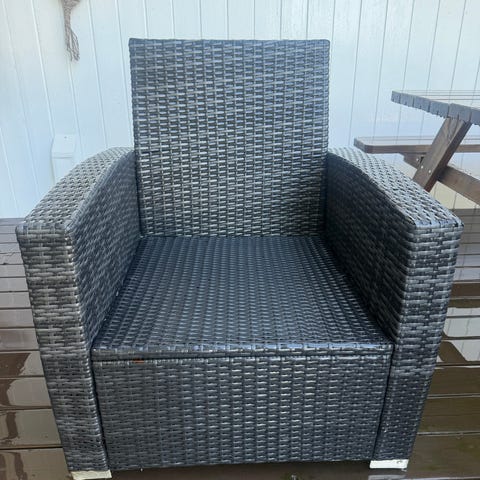 Lenestol i kunstrotting med rette linjer og armlener. Stolen har mørk rottingfarge og leveres med grå sete- og ryggpute. Egnet for bruk på terrasse, balkong eller i hage, for én person. Godt brukt, men kan brukes igjen. Kom i hent i løpet av de neste dagene. Kan diskutere pris.