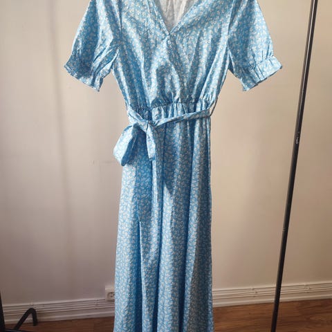 Sommerkjole for dame i størrelse S. Kjolen er blå og laget i polyester. Modellen har v-utringning, knapper i front og markert liv. Stoffet har strukturert overflate med rutete preg. Ermene er trekvartlange med lett puff og strikk nederst. Lengden går omtrent til leggen, avhengig av høyde. Passer som sommerkjole eller til hverdagsbruk.