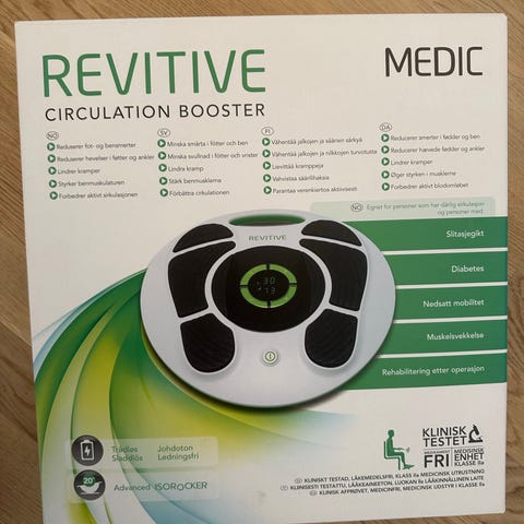 Revitive IX sirkulasjonsapparat for føtter. Enheten er utformet som en fotplate med kontroller i midten og fotputer på oversiden. Apparatet leveres med strømforsyning og tilbehør som ledninger og elektrodepads, slik det vises på bildene. Produktet er beregnet for bruk mens man sitter, der føttene plasseres på fotputene for stimulering av sirkulasjon. Fargekombinasjon hovedsakelig hvit, svart og grønn.