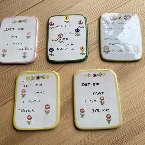 Saga veggplater i keramikk med norsk folkedraktmotiv. Settet består av tre veggplater i ulik størrelse med dekor i flerfarget trykk av tradisjonelle figurer og blomster. Platene har hull øverst for oppheng på vegg. Produsert i Norge, merket «Saga norsk design handpainted stoneware FF Norway» på baksiden. Egner seg som veggdekor på kjøkken eller andre rom der man ønsker et motiv med norsk tradisjonsdesign. Den store platen har en liten skade, se bilde nr. 2. Selges for 300 kr samlet.