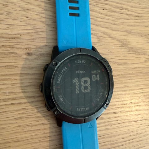 Garmin Fenix 6X Sapphire multisport GPS-klokke i svart. Klokken har safirglass og robust urkasse med silikonreim. Den er egnet til ulike typer trening og friluftsaktiviteter, med integrert GPS og pulssensor på undersiden av klokken. Leveres med original eske som vist på bildene.