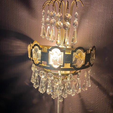 Tre prismelampetter i messing. To kan kobles til strømuttak på veggen, den tredje har lang ledning med av/på bryter, denne kobles i stikkontakten. Prismelampettene har plass til en lyspære. Lyspærer medfølger. Lampettene er blitt renset etter at de ble tatt ned.
