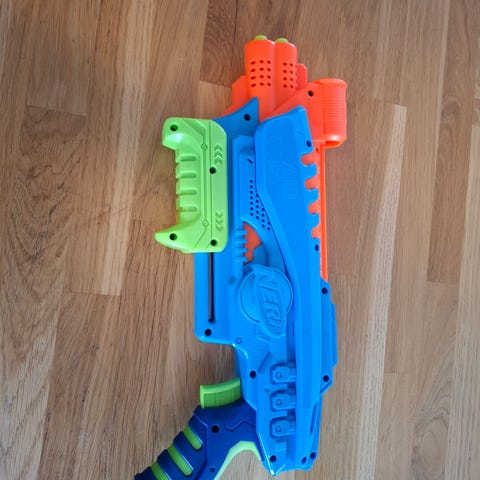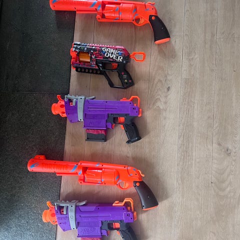 Nerf leker våpensett i plast, flerfarget. Settet består av flere ulike Nerf-leker i forskjellige størrelser og utforminger, med tydelige signalfarger som gul, oransje og blå. Produktene er laget i hard plast med detaljer som løp, sikte og håndtak tilpasset barnehender. Egnet som utendørs og innendørs lek for barn som liker actionpregede rolle- og fantasileker. Brukes med tilhørende Nerf-skumprosjektiler (ikke synlig på bildene).