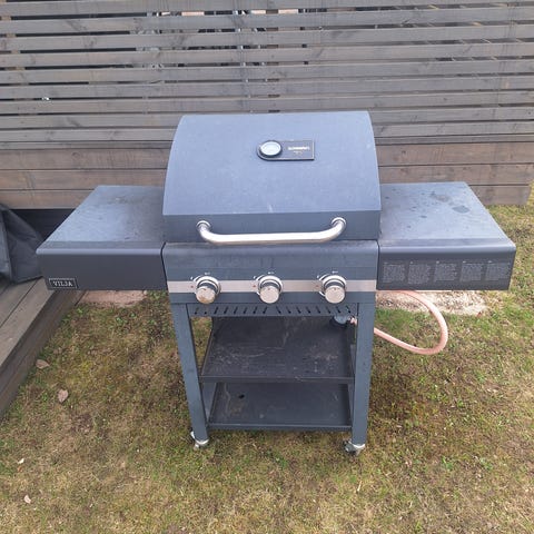 Gassgrill med 6 hovedbrennere og sidebrenner. Grillen har lokk med innebygd termometer og store sidehyller for avsetting av utstyr. Grillristene er i metall og det er oppsamlingsområde under grillflaten. Under grilldelen er det åpen hylle til oppbevaring, det er med dører. Gasslange og regulator følger med, men ikke gassflaske.