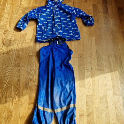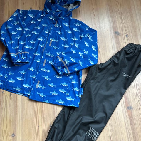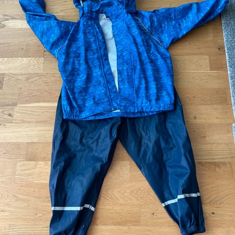 Name it regntøysett for gutt i størrelse 140. Litt brukte og i god stand. Sett med jakke og bukse i blå farge, med mønster på jakken. Jakken har hette og glidelås foran. Buksen har strikk nederst i beina, men det ble fjernet og brukes til andre bukser, kjøper må skaffe selv med ønsket.