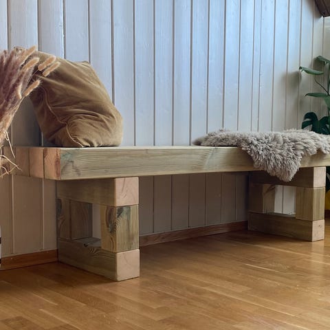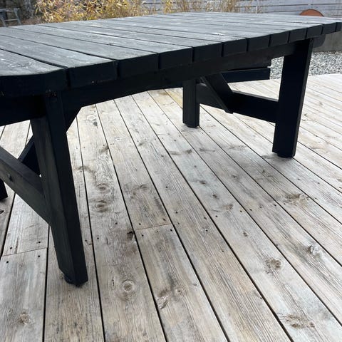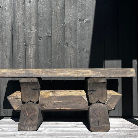 Massiv trebenk. Håndlaget. 200 cm lang, 39 cm bred, 46 cm høy . Benken har hvit overflate på sitteflaten og sort understell med to benforinger og tverrstag mellom bena. Undersiden av platen har trestruktur. Egnet som sittebenk på terrasse, hage eller inne, avhengig av behandling og plassering.