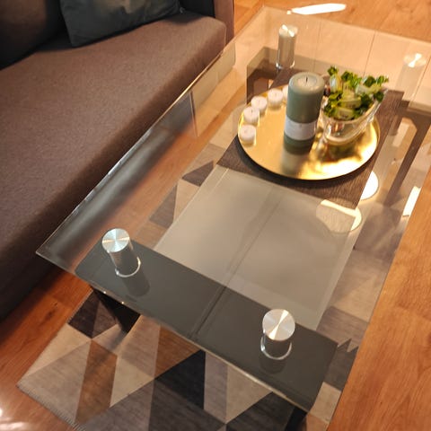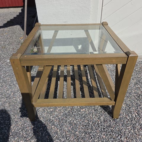 Nydelig bord i lys grå glatt granitt (tror jeg) i føtter og glass feste. Rør i sølv mellom hylle og bordplate. Hyllen er i pen, tykk, sort glass, og bordplaten i klart glass. Bordet trenger nok en liten vask.