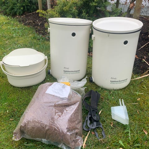 Bokashi kjøkkenkompostbøtter i svart plast med tappekran. Settet består av to bøtter med en tappestasjon som flytter lett mellom bøttene. Følger med en stor sekk bokashistrø.