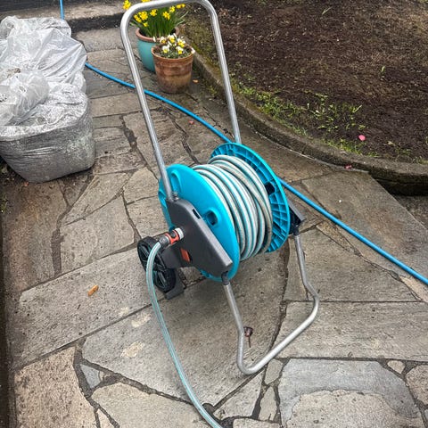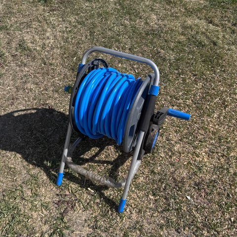 Slangetrommel på tralle med hageslange
