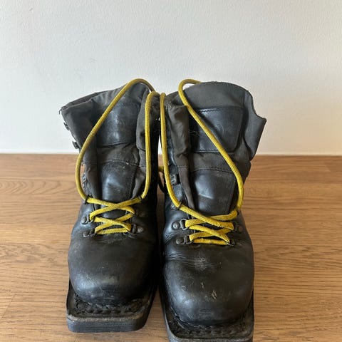 Skisko i svart lær med gule lisser. Skoene har høy ankelstøtte og polstret skaft for ekstra komfort. Sålen er kraftig og egnet for turbruk. Passer til fjellski. Str 42