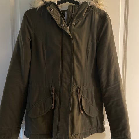 Zara vinter / høstjakke til dame i størrelse XL i fargen brun. Den har en hette med fuskepelskant og mykt teddyfôr på innsiden. Store fine lommer med trykknapper. God å varm!