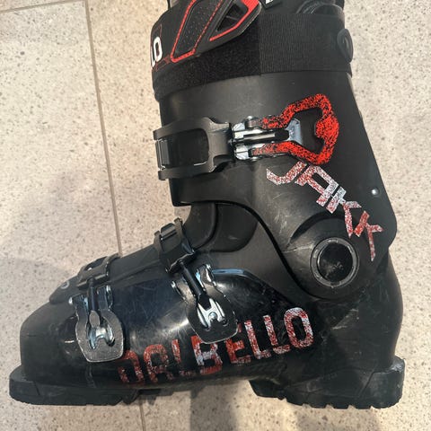 Dalbello Jakk alpinstøvler i svart farge. Støvlene har fire spenner og powerstrap øverst for bedre tilpasning rundt leggen. Ytterskallet er i plast med sjakkmønstret design på sidene. Sålelengde er merket 285 mm under støvelen. Passer til vanlige alpinbindinger og er egnet til bruk i alpinbakke.