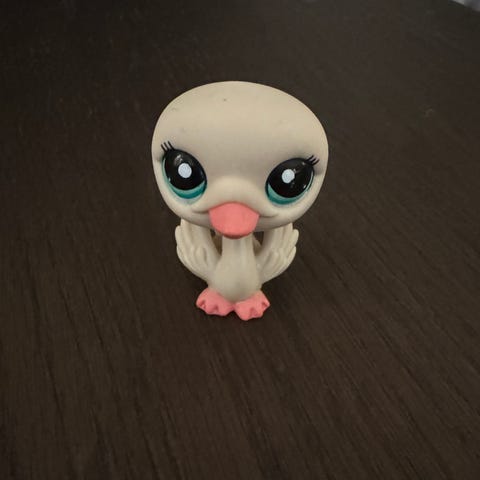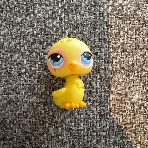 Leketøyet på bildet er en gul kyllingfigur fra Hasbro's Littlest Pet Shop (LPS). Denne spesifikke formen har blitt brukt for flere ulike nummererte figurer i serien, ofte identifisert ved fargen på øynene og unike merker. Leketøyet på bildet er en Littlest Pet Shop (LPS) kylling, nærmere bestemt modell #2419.