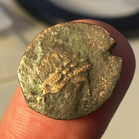 Antikk gresk mynt 135. Mynten er under vurdering av korrekt ID