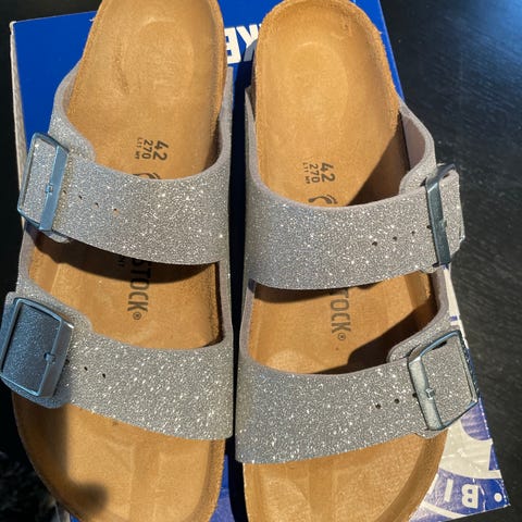 Birkenstock Arizona sandaler i størrelse 41. Modellen har to justerbare remmer med spenner. Farge svart med leopardmønster. Overdel i syntetisk materiale og klassisk Birkenstock-fotseng. Egnet som hverdagssandaler og innesko.