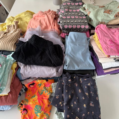 Klespakke med vårklær i str 146/152. Klespakken inneholder: 2 skjørt, 2 kjoler, 1 tynn genser, 1 strømpebukse, 4 hettegensere, 2 tykke bomullsgensere, 10 bukser/tights.