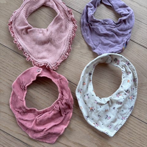 Seks siklesmekker til baby. Fine og rolige fargetoner, knapper i nakken. Praktisk når baby får tenner!