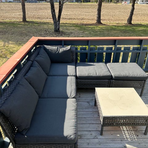 Pent brukt rotting gruppe selges. 230 x 230. Bord med glassplate. Gråmelerte rygg og sitteputer. Ingen skader eller solbleking av putene.