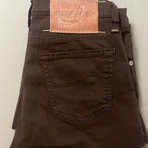Selger en Jacob Cohën jeans i blå denim for dame. Buksen har størrelse XS og livvidde W26. Klassisk femlommersmodell med glidelås og knapp i front. Bak finnes en karakteristisk merkelapp.