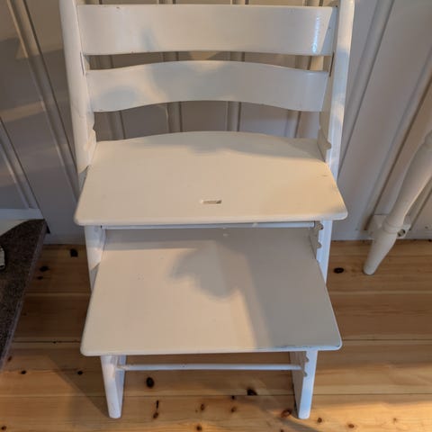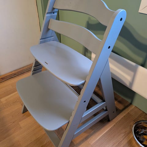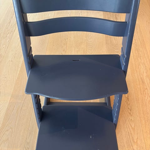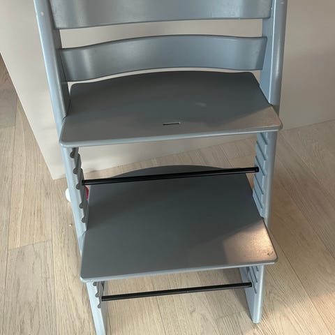 Stokke tripp trappi grå farge. Stolen har justerbart sete og fotbrett som kan tilpasses barnets høyde. Egnet som spise- og sitteplass ved bord. Utført i solid materiale med klassisk trappekonstruksjon som gir stabilitet. Passer til bruk i hjemmet ved spisebord eller andre bordhøyder der barnet trenger en trygg og høy sitteposisjon.