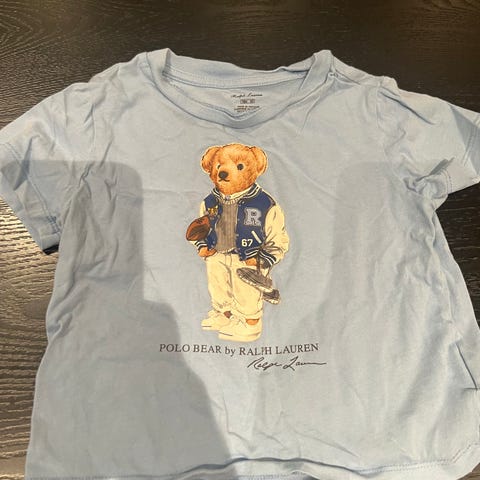 Polo Ralph Lauren Polo Bear t-skjorte for gutt i størrelse 128. T-skjorten er blå og laget av bomull. Fronten har
