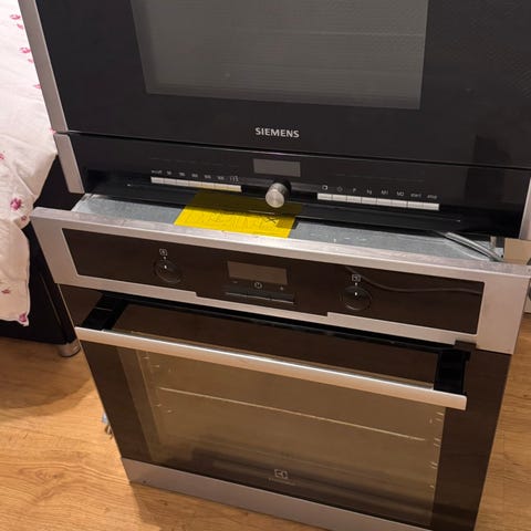 Siemens mikrobølgeovn i stål. Front i rustfritt stål med mørk glassdør og betjeningsknapper under displayet. Beregnet for innbygging i kjøkkeninnredning. Passer til oppvarming og tining av mat i hverdagsbruk.