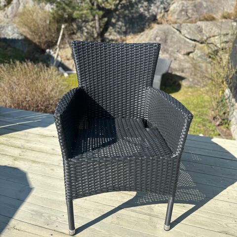 Hagestol i metall med lameller i sete og rygg. Stolen har svart ramme og sete, samt turkise armlener. Egnet for bruk utendørs på terrasse, balkong eller i hage. Utformet som en enkel loungestol med rette linjer og åpen rygg og sete for drenering av vann.