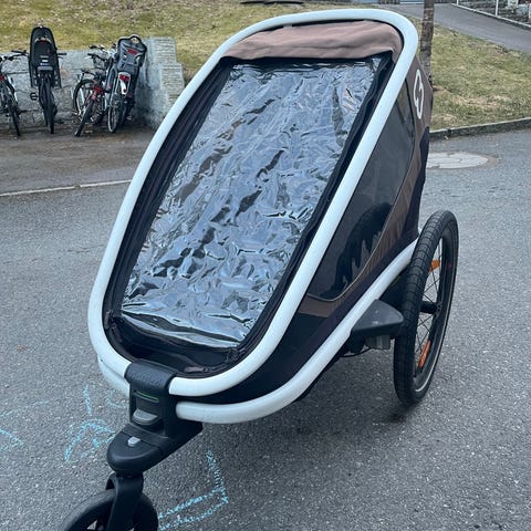 The trailer is practical and comfortable for children, with space for two. Can be used both as a bike trailer and as a stroller.